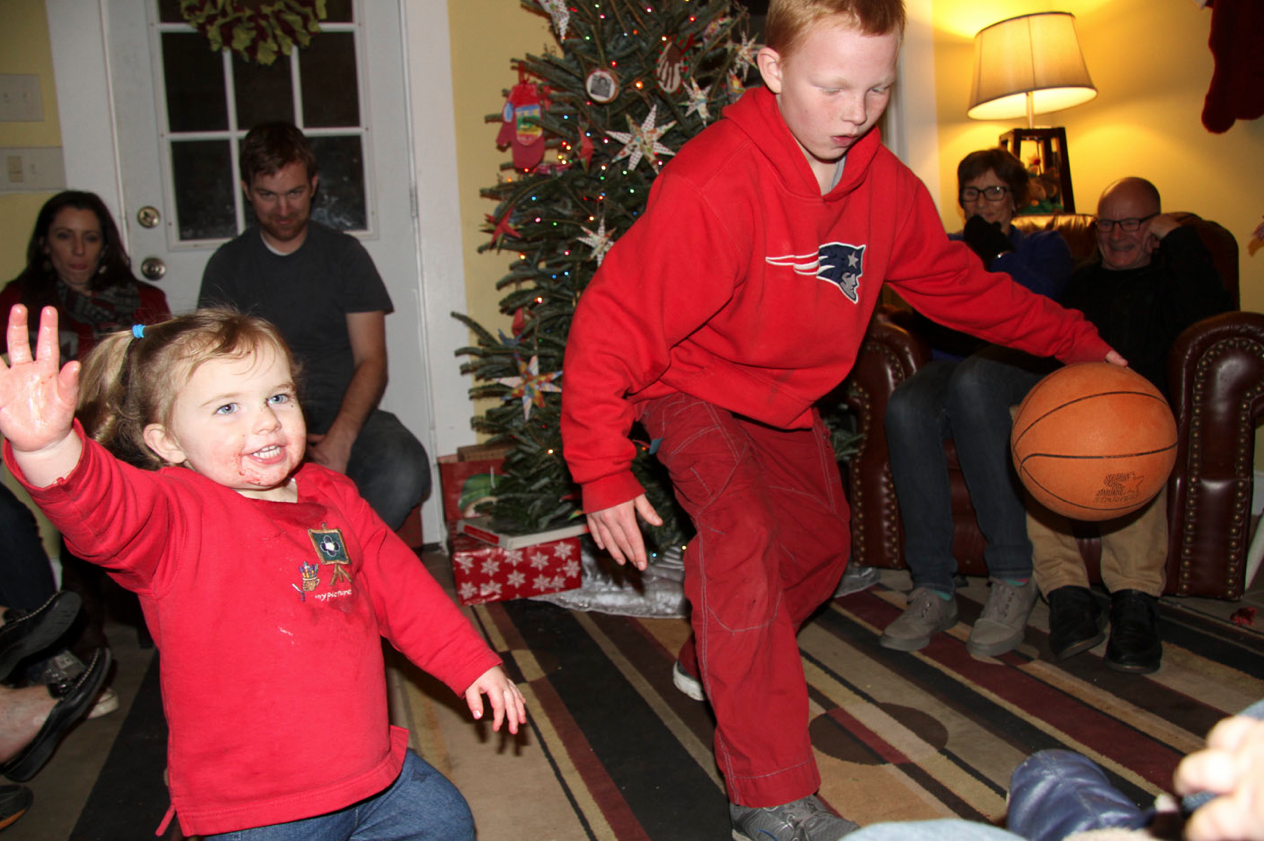 K80 & JD hosted our Christmas Eve dinner and we had a quite a crew. Mike & Pete manned the BBG in the frigid weather. I wish I had gotten a picture of them. We had lots of yummy food and our second annual talent show with a good variety of talent from the kids. Somehow we even managed to get a picture with all of us.